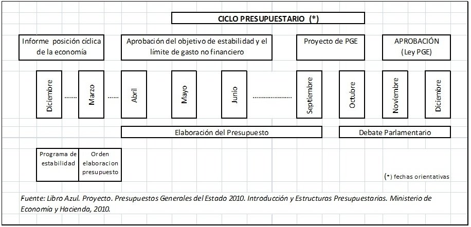 Podemos decir que son 4 las Fases las que componen el proceso presupuestario: la elaboración, la aprobación, la ejecución y el control. En esta aproximación a los PGE nos vamos a referir principalmente a las dos primeras fases que quedan resumidas en el siguiente cuadro: